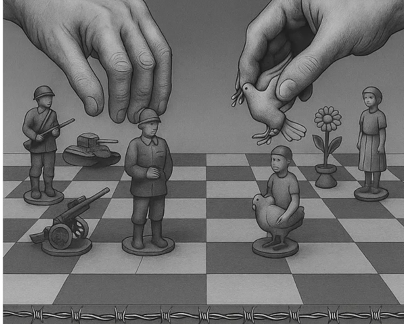 Die Geschichte dreht sich um die Konfrontation zwischen Krieg und Frieden, dargestellt durch zwei Protagonisten. Das Stück reflektiert nicht nur globale Konflikte, sondern auch die persönlichen Fragen und Unsicherheiten der Jugendlichen. Es ist ein Spiegelbild unserer Zeit, erzählt aus der Sicht junger Menschen, die sich in einer Welt voller Unsicherheit und Konflikte zurechtfinden müssen.